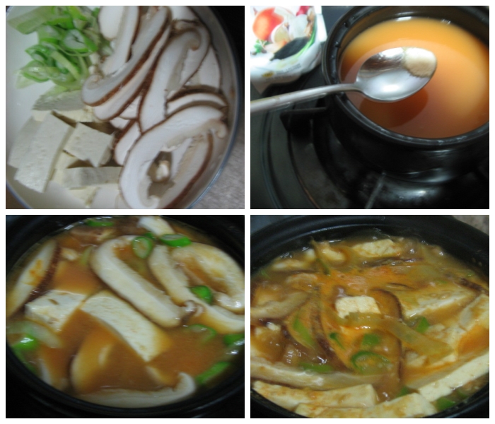된장만 하기 밋밋해 청양초 대신에 고추장을 조금 풀어서 천연 조미료 조금 하고 표고버섯 두부 넣고